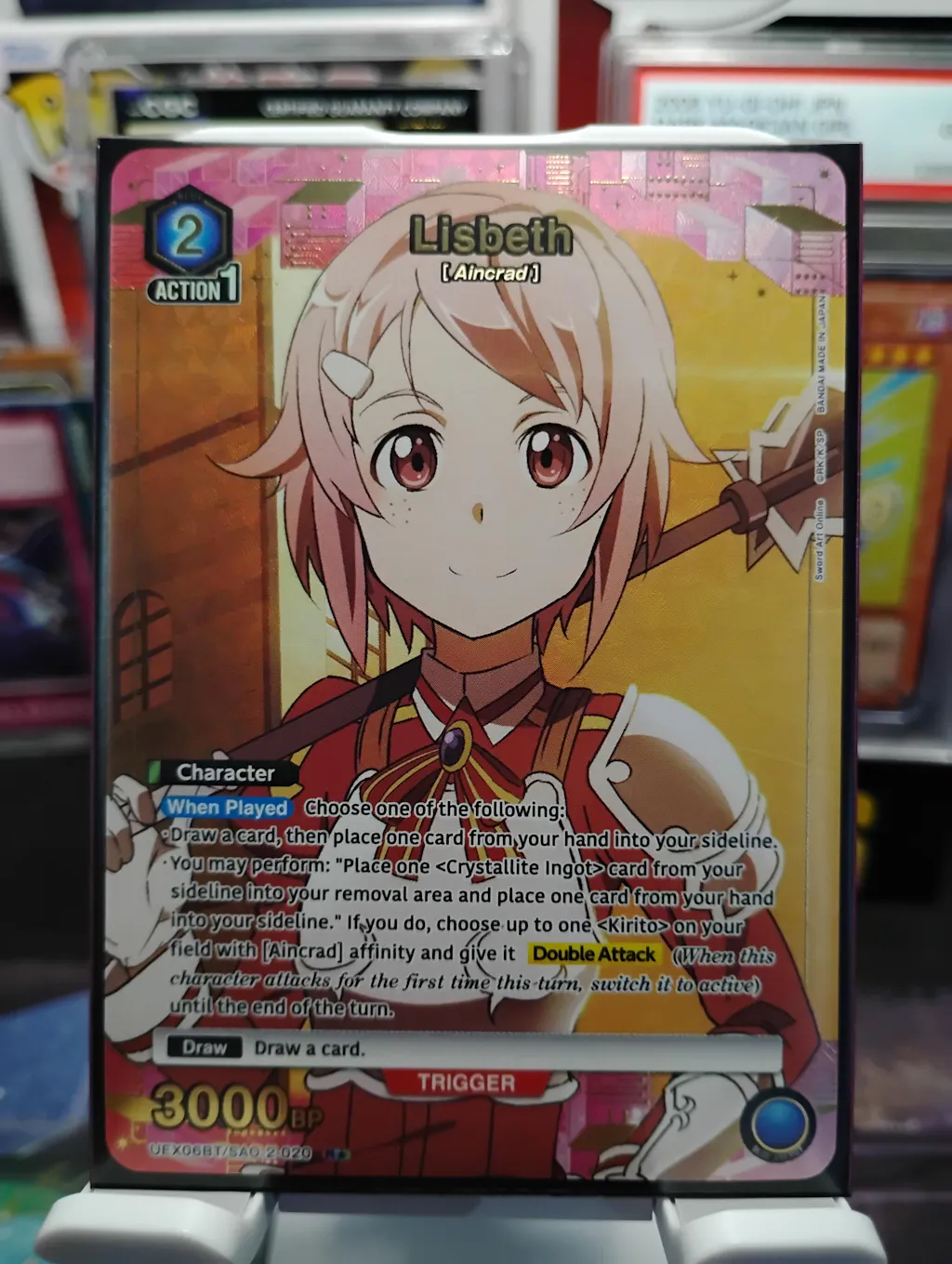 Chase the ultimate rarity in Sword Art Online Vol.2—an SR★★★ card with a new illustration and a printed signature from a beloved Japanese voice actor! SR★★ cards also include foil-stamped signatures, giving collectors even more reasons to hunt for their favorite characters. With striking visuals and cast authenticity, these cards are must-haves for SAO fans and TCG collectors alike.